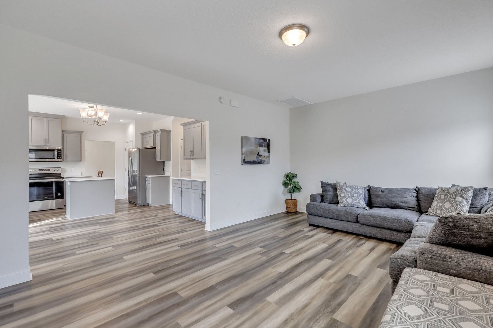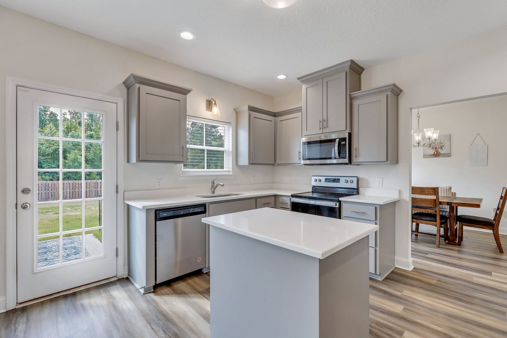 The dining room seamlessly flows into the well-appointed kitchen, which includes a prep island, breakfast area, and a clear view of the spacious family room, creating a warm and inviting atmosphere. The kitchen is equipped with modern appliances and ample cabinet space, making meal preparation a breeze.