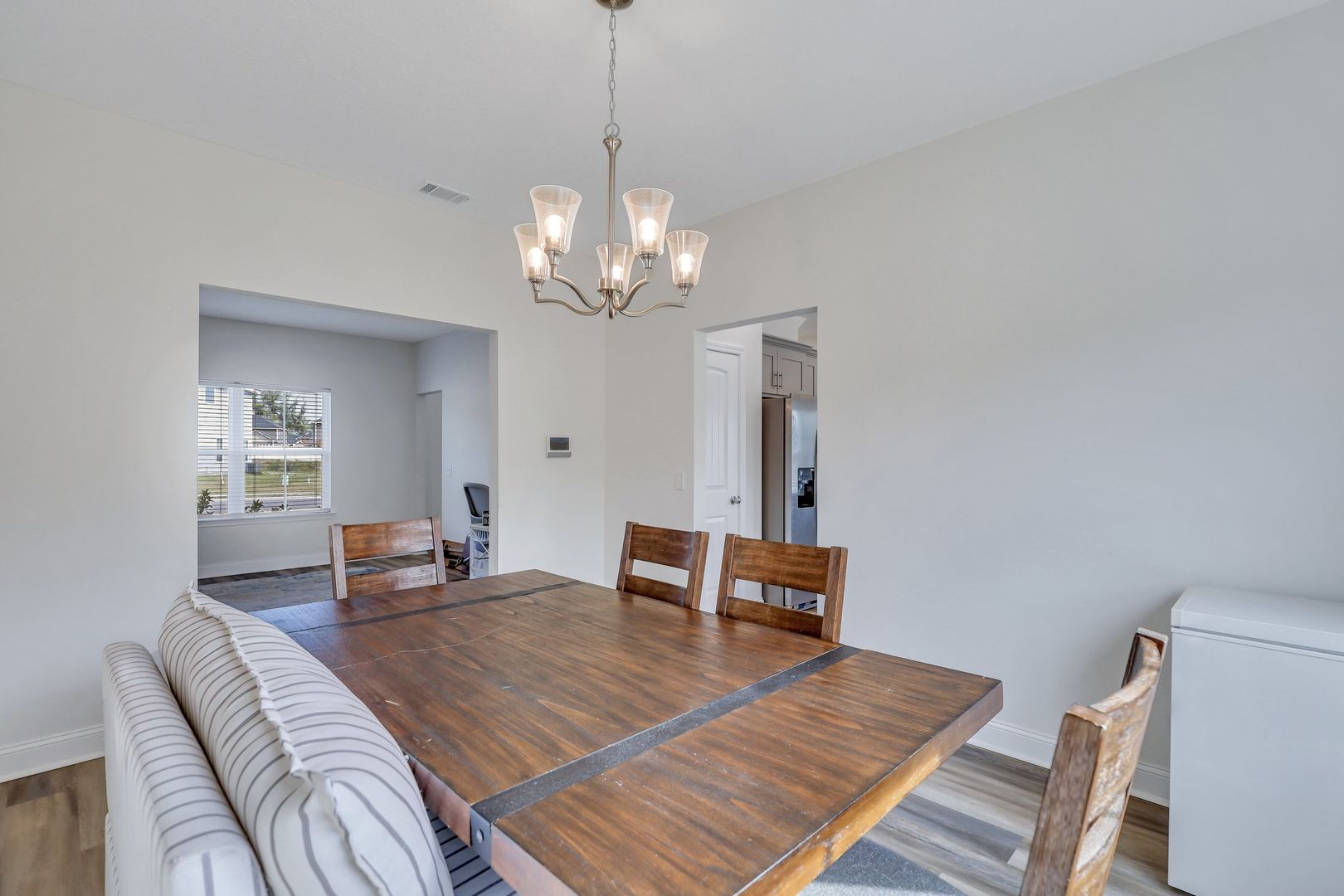 Upon entering, you are greeted by a grand 2-story foyer entry that sets the tone for the elegance within. The main level features a spacious living room, perfect for entertaining or relaxing. Adjacent to the living room is a formal dining room, complete with a chandelier, ideal for hosting gatherings or intimate meals.