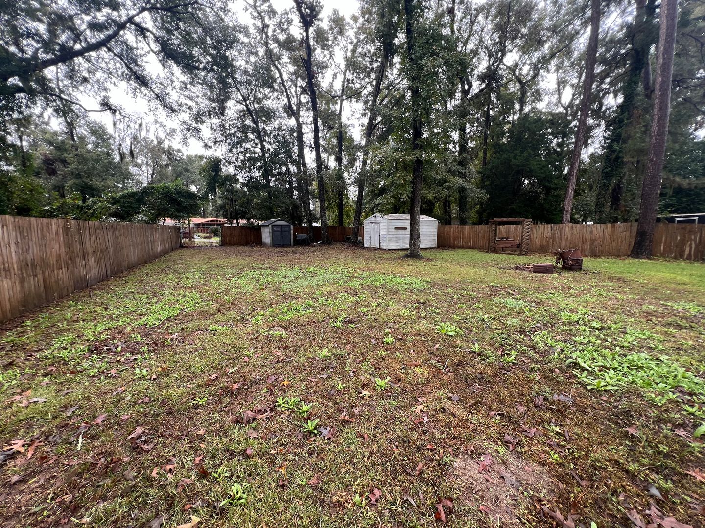 The large backyard is .46 acres and includes a covered workspace and storage shed.
