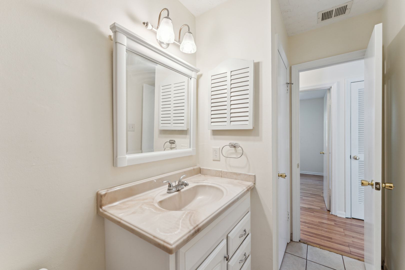 Enjoy the convenience of blinds throughout, newer bathroom vanities, and carpet in two bedrooms only. The kitchen and bathrooms boast tile flooring, while the hallway, living room, and one bedroom showcase beautiful wood laminate flooring.
