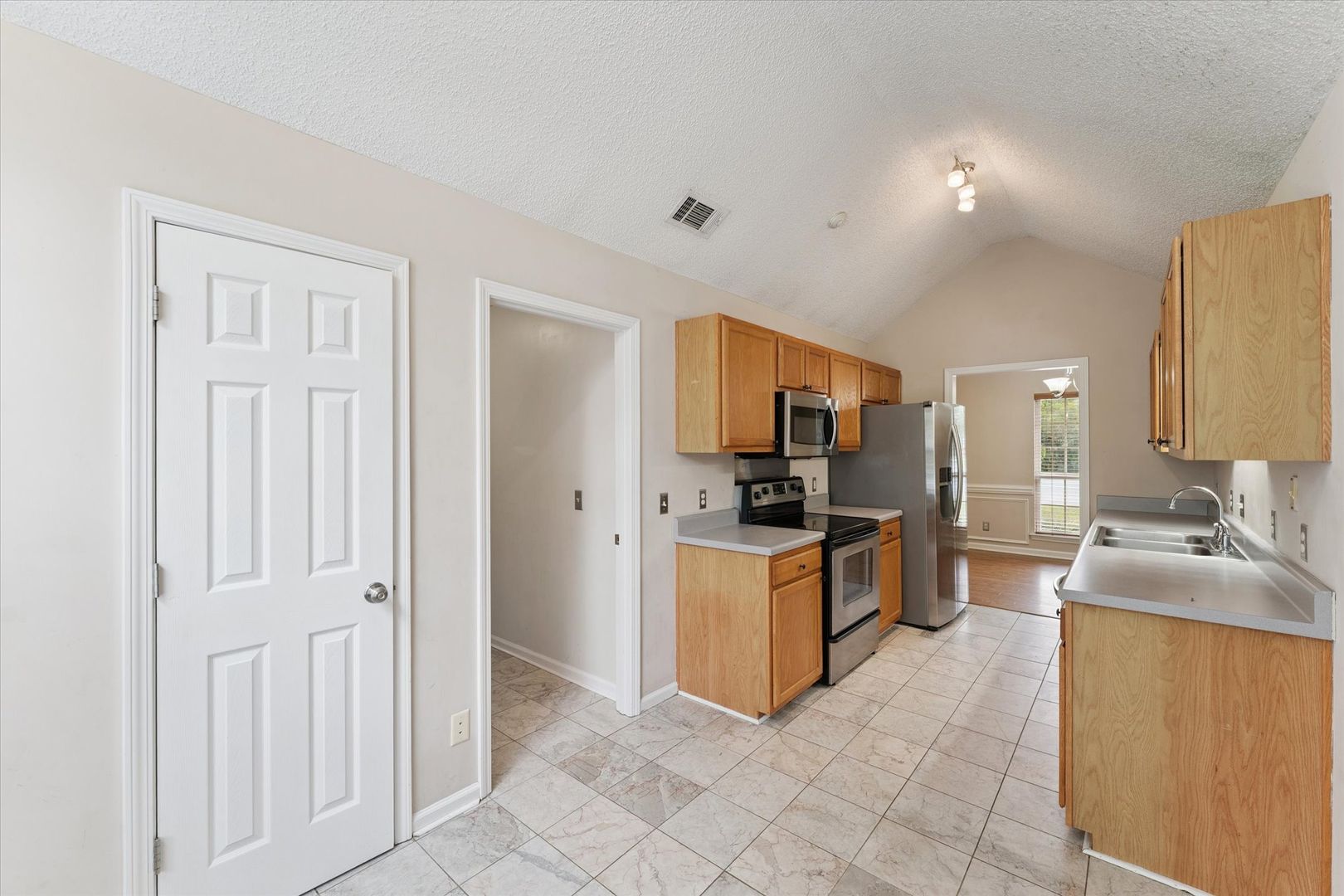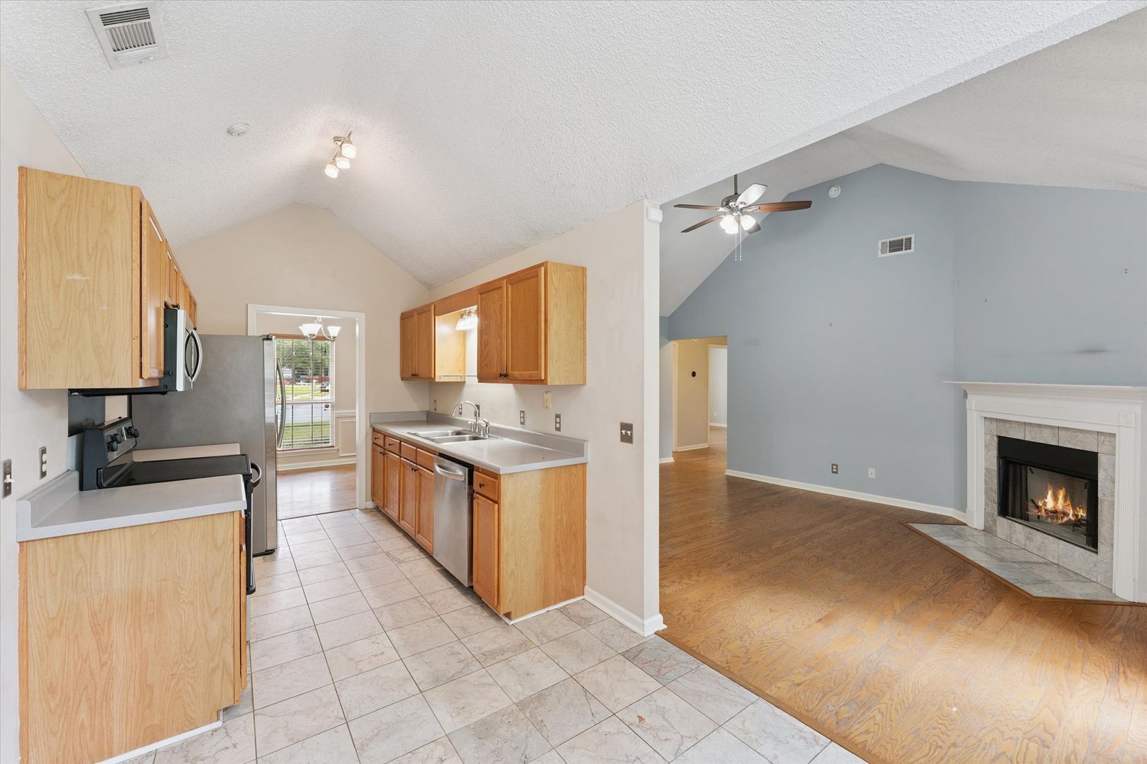 The Living room has cathedral ceilings and a wood burning fireplace, separate formal dining room with tray ceilings off of the living room, and a galley kitchen featuring stainless steel appliances, cathedral ceiling and eat-in kitchen dining area.