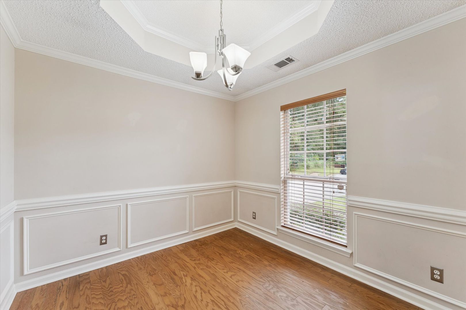 The primary bedroom has wood flooring, tray ceilings and an ensuite bathroom with double vanity sinks, shower/tub combo, and extra closet space.