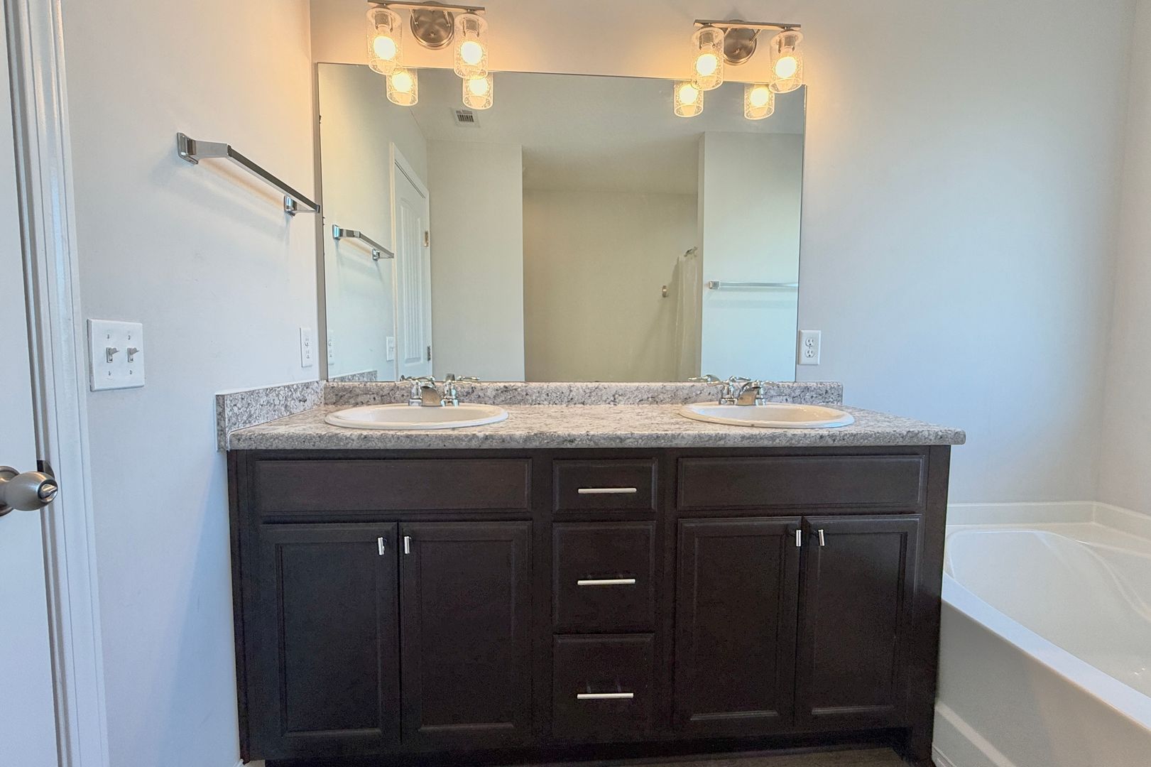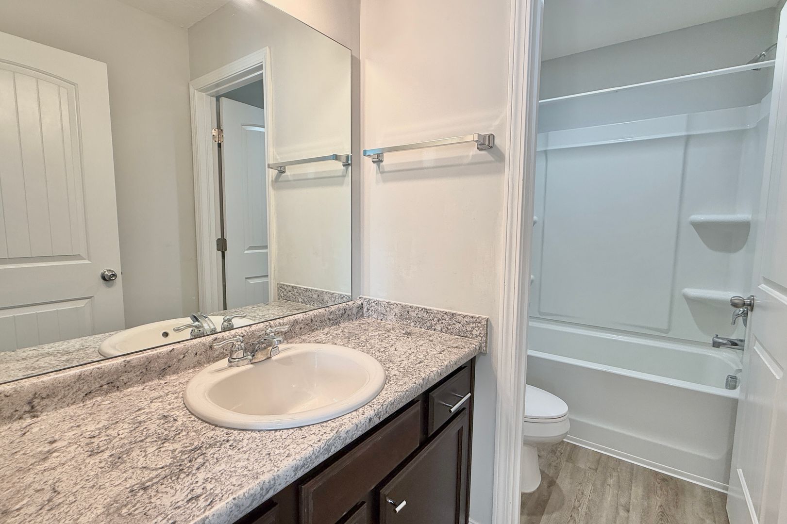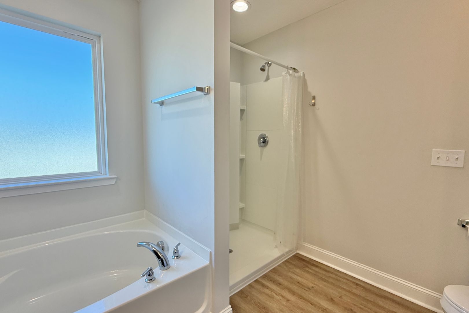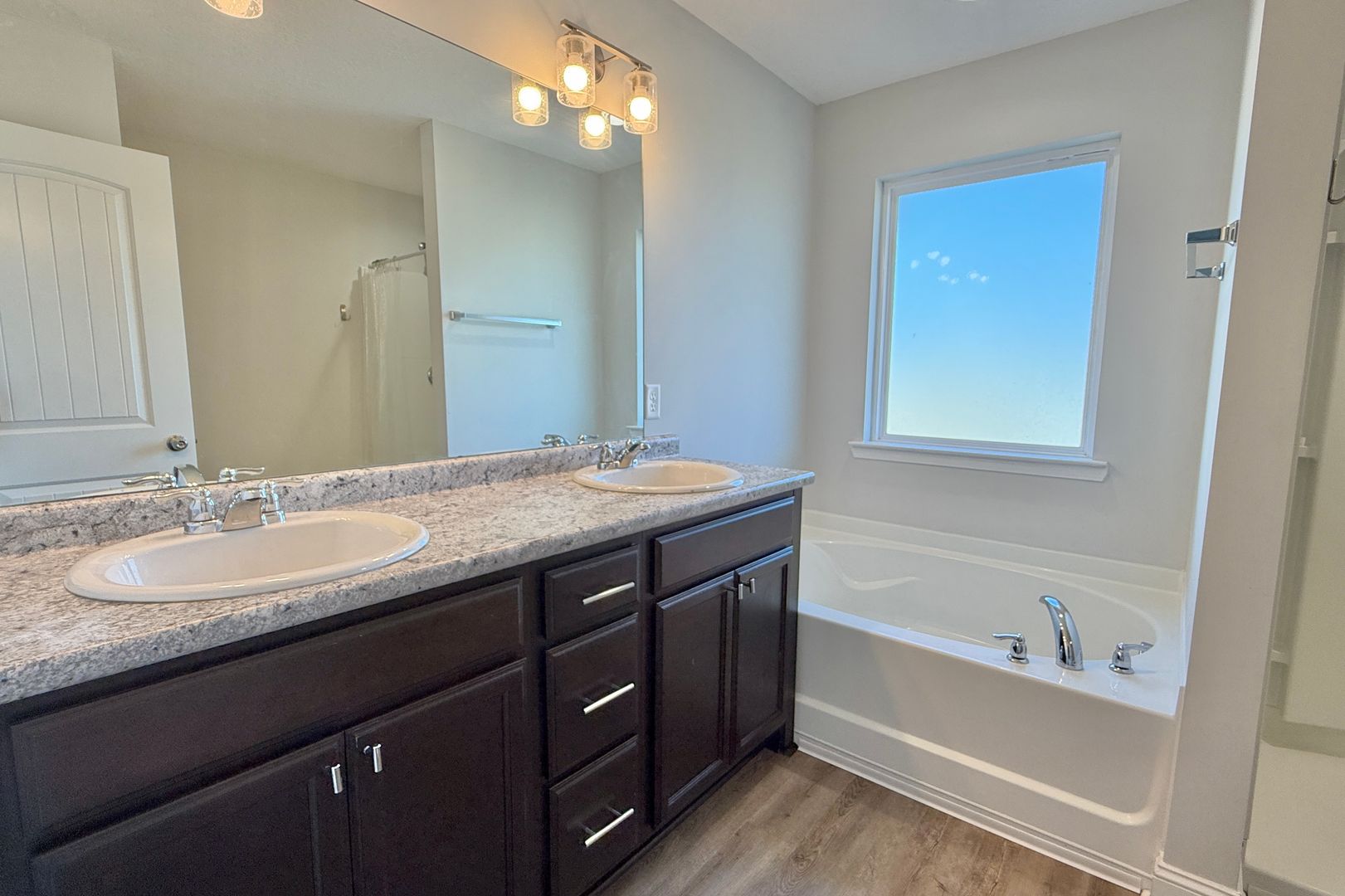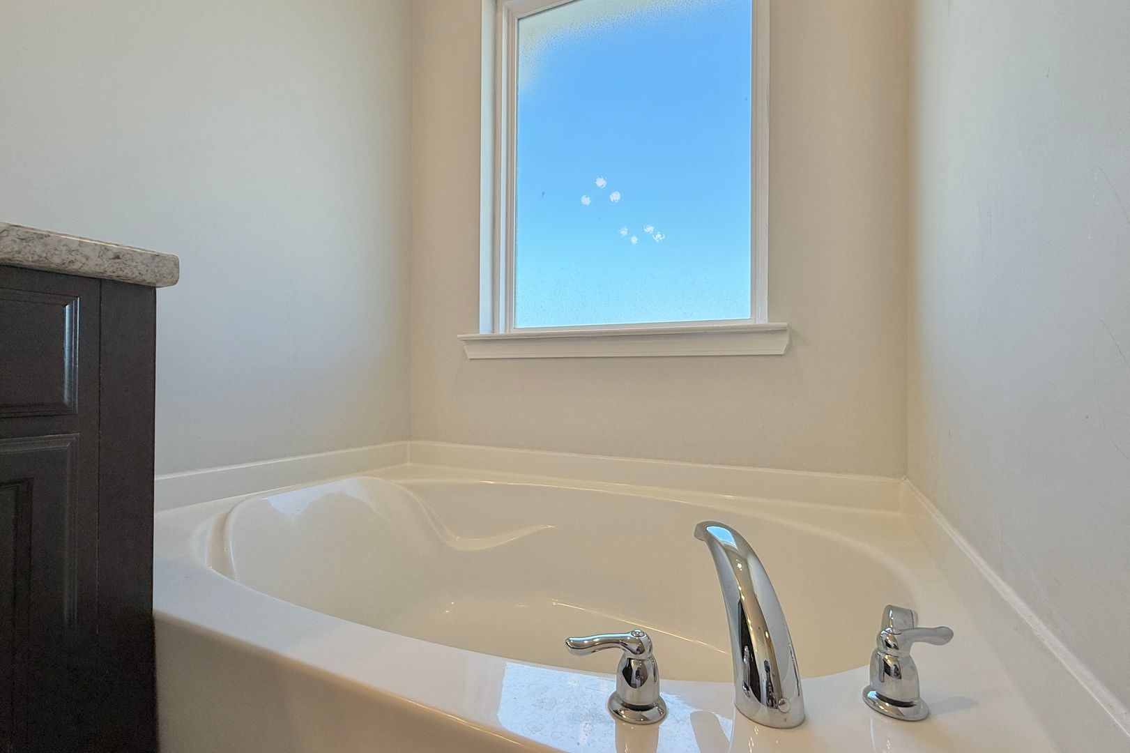 Upstairs, the primary bedroom offers plenty of space and includes a private bathroom with a large shower and separate garden tub. Three additional bedrooms, full guest bathroom, and a laundry room complete the second floor.