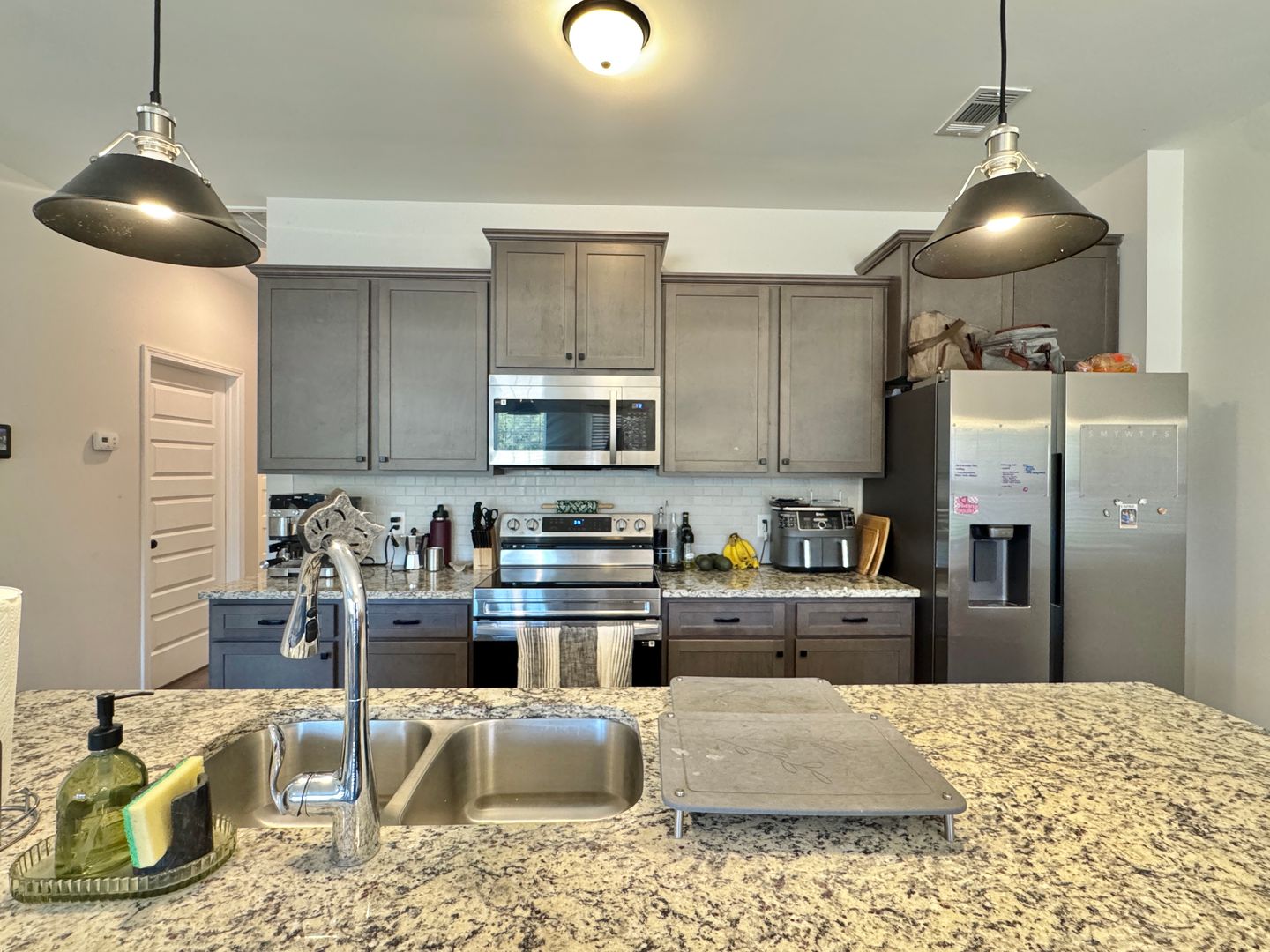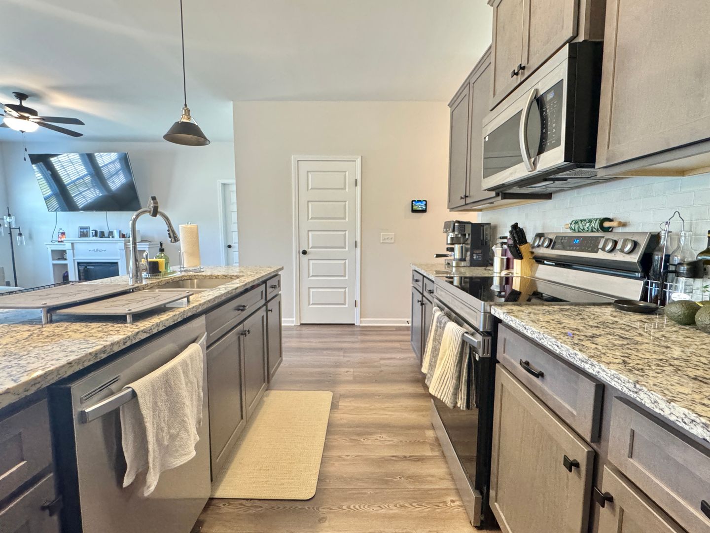 • Updated Kitchen: Features a center island with sink, stainless steel appliances, ample counter space, and a walk-in pantry.